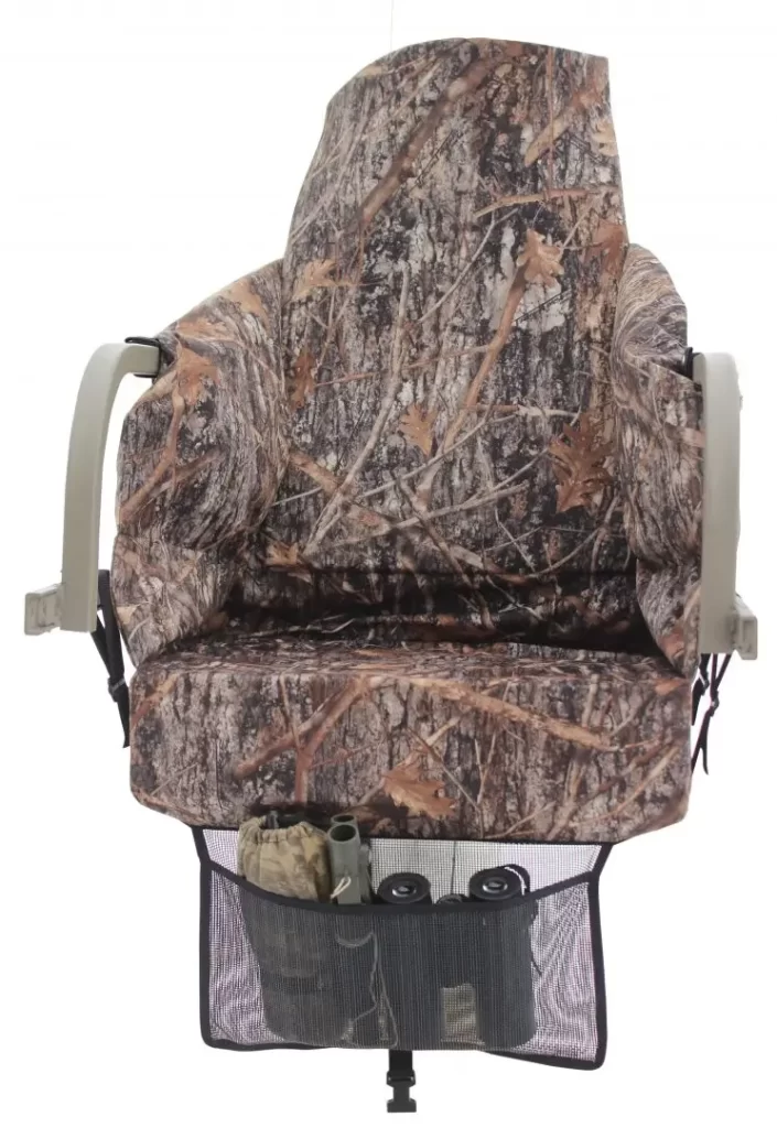 The features don’t stop there- It has a revolutionary new hanging nylon mesh pocket that can store a deer hunters calls, binoculars , camera , water, etc… The pocket can also be locked up out of the way if you so prefer, making a nice storage area – close by and with quick access .